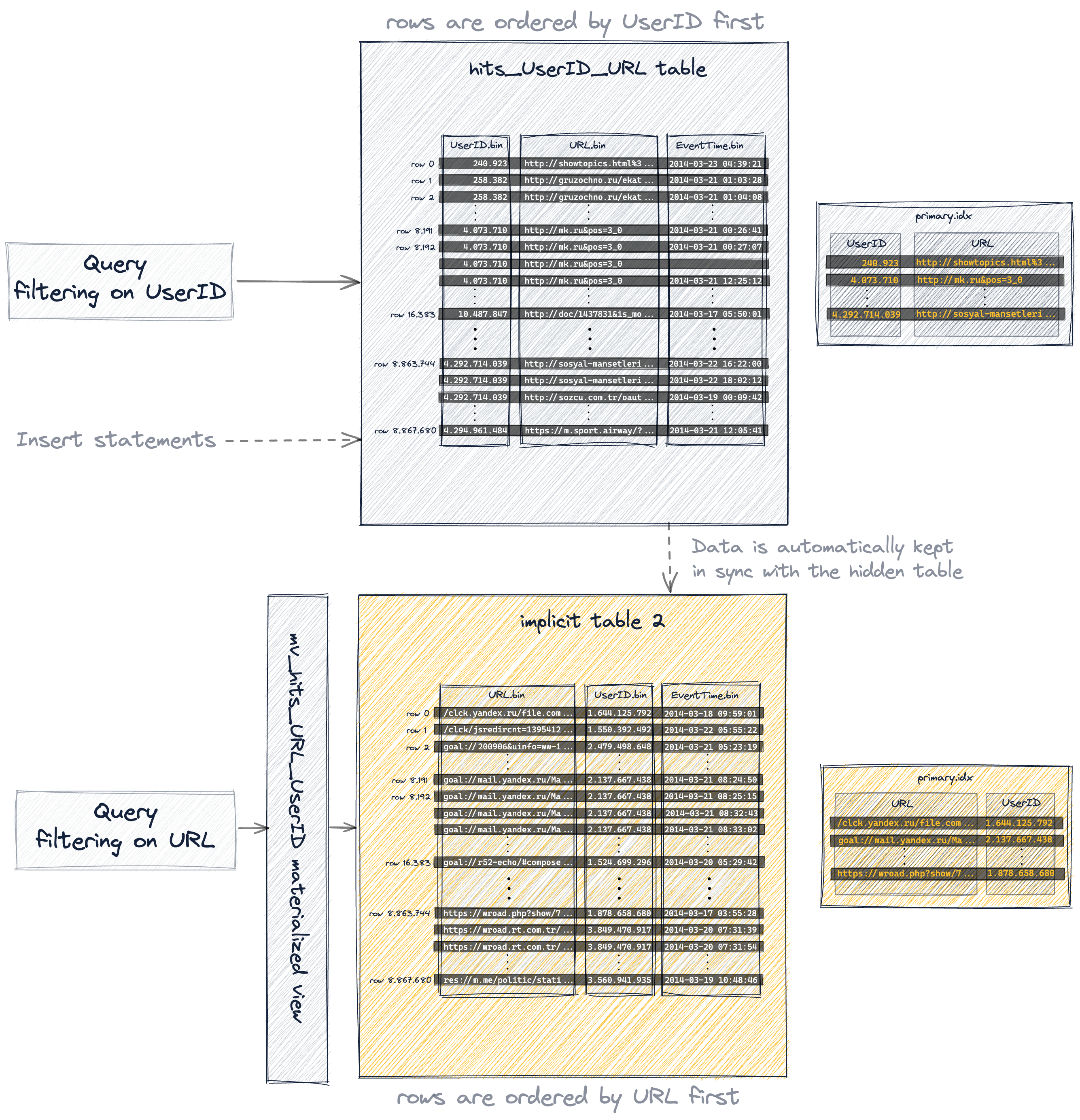 To make this (way) more efficient and (much) faster, we need to use a table with a appropriate primary key. This will allow ClickHouse to automatically (based on the primary key’s column(s)) create a sparse primary index which can then be used to significantly speed up the execution of our example query.