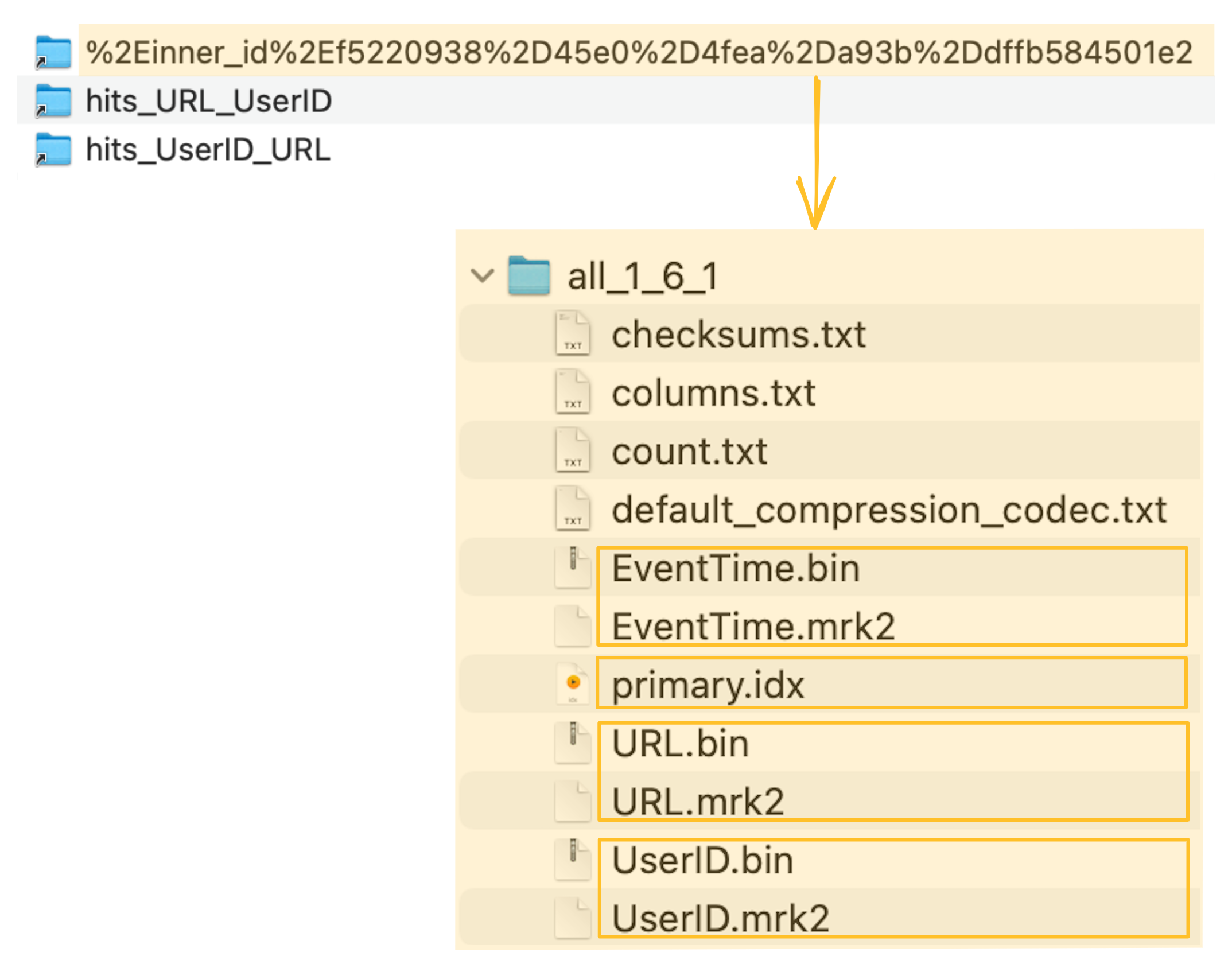 In ClickHouse the physical locations of all granules for our table are stored in mark files. Similar to data files, there is one mark file per table column.